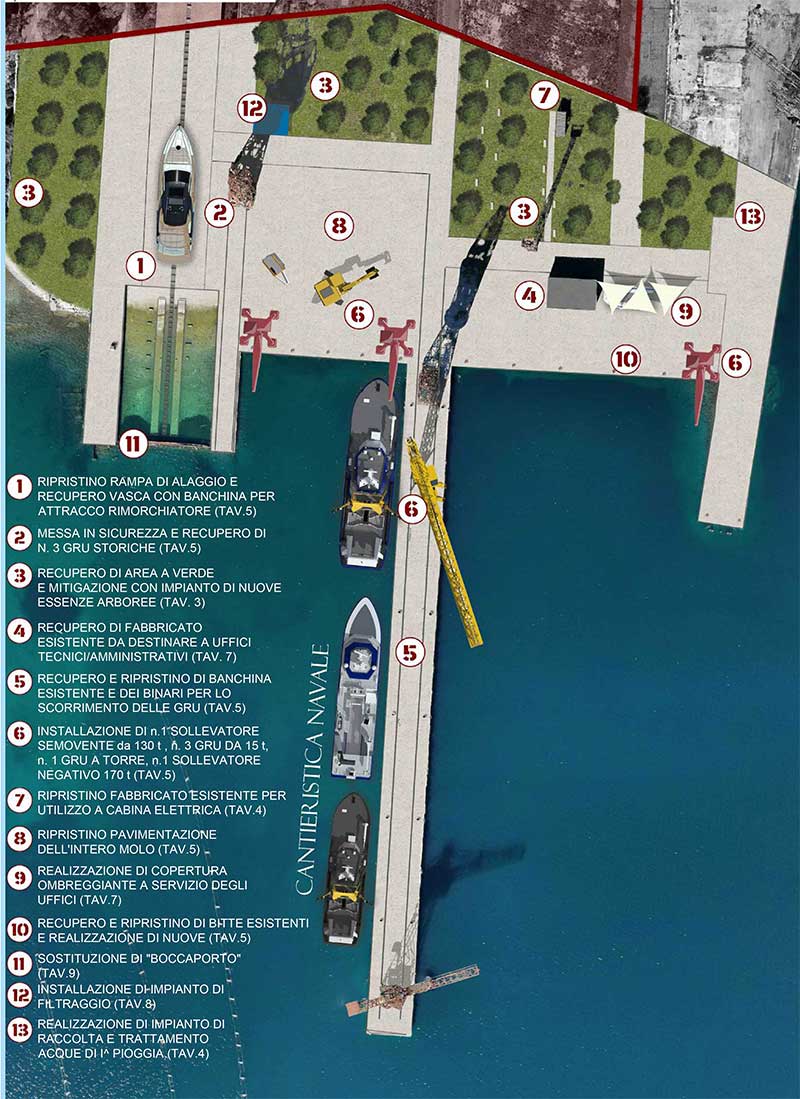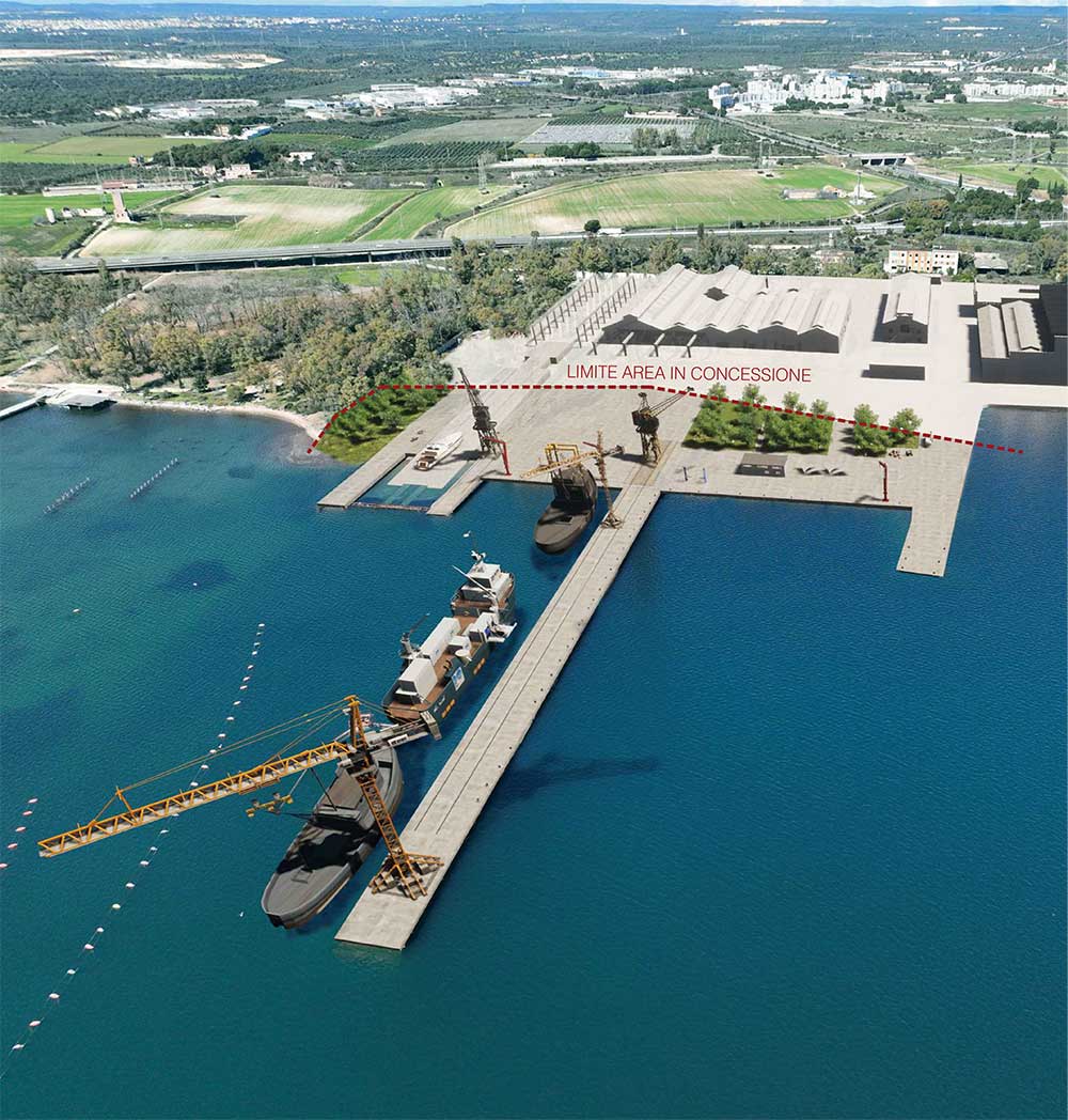 Il progetto del Gruppo Jolly Officine prevede una rifunzionalizzazione di tutte le aree dismesse dei cantieri ed una riqualificazione degli spazi circostanti, offrendo l'opportunità di interconnessione tra le attività private e all'area demaniale oggetto di gara. L'area d'intervento che Jolly Officine ha attualmente in essere è rappresentata da due importanti ambiti, uno relativo al recupero di un'area destinata alla cantieristica navale e meccanica, individuata con il colore arancio e una ulteriore area, in verde, caratterizzata dalla valorizzazione di un ambito ambientale e naturalistico che possa armonizzare e mantenere inalterato lo scenario storico dell'ambito di intervento. L'area demaniale rappresenta quindi il completamento di un progetto ambizioso, destinato a caratterizzare l'intero ambito in cui ricade l'area demaniale oggetto del presente bando. Il Gruppo Jolly Officine, quindi, garantisce la valorizzazione dell'ambito demaniale attraverso l'individuazione di 3 aree funzionali ben distinte: · Cantiere Navale costituito da officine e capannoni soggetti a ripristino e manutenzione straordinaria, con rifunzionalizzazione delle aree esterne; · Parco verde attrezzato e nuovo porticciolo: La realizzazione del Parco Verde Attrezzato prevede la riconversione di un'area verde adiacente ai cantieri, per una più ampia fruibilità dei luoghi. L'area parco avrà una strada di accesso indipendente dalle altre zone di interesse dell'intervento, e si svilupperà attraverso percorsi pedonali con aree di sosta attrezzate, aree ludiche per il gioco e lo sport, servizi, la realizzazione di una spiaggetta per il noleggio di canoe e la delimitazione di un campo di allenamento per canottieri e la realizzazione di un nuovo porticciolo di diporto per imbarcazioni ad uso turistico; · Area demaniale oggetto di concessione, da destinare ad attività produttive con finalità di cantieristica navale, con particolare riferimento alle opere di ripristino funzionale di moli e banchine presenti Il disegno del nuovo cantiere navale pone le basi per una riqualificazione urbana e paesaggistica dell'intera porzione di territorio che attualmente risulta abbandonata e disarticolata e che in attuazione a questa attività pianificatoria, potrà riconquistare un corretto assetto territoriale produttivo, generando nuova qualità urbana e nuove occasioni di lavoro, definendo così un progetto che si pone consapevolmente come un piano ad incremento zero delle volumetrie e puntando al riuso ed al potenziamento qualitativo dell'esistente. L'obiettivo che la società proponente si è prefissa è di realizzare un'infrastruttura integrata nell'“ambiente” locale la cui gestione garantisse lo sviluppo economico e sociale dell'intero ambito territoriale, contestualizzato all'interno di un contesto ambientale prezioso per la città di Taranto.
