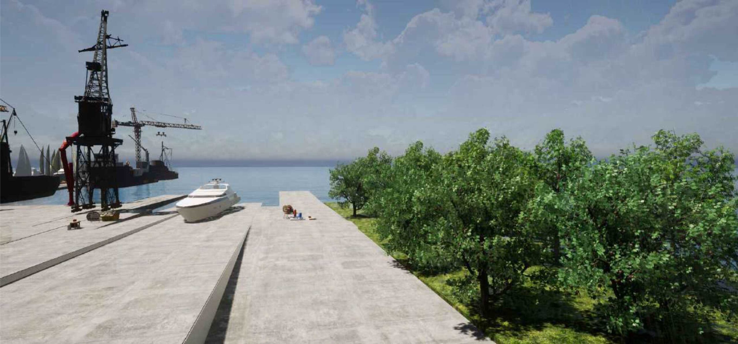 Il progetto di valorizzazione e recupero dell'area demaniale, prevede la piantumazione di nuove essenze arboree autoctone e l'installazione di panchine e attrezzature per la pausa dei lavoratori. La piantumazione proposta, oltre a garantire una maggiore sostenibilità ambientale e paesaggistica, risulta poter essere una barriera antirumore e valida schermatura di mitigazione visiva, relativa alle attrezzature e strutture esistenti. La creazione di una barriera a verde risulta poter contenere l'impatto acustico derivante dalle attività di sabbiatura e verniciature delle imbarcazioni e una minima introspezione alle attività svolte all'interno del cantiere. Inoltre, l'area a verde rappresenta la mitigazione visiva degli impianti fuori terra, come l'impianto di trattamento delle acque meteoriche. La riqualificazione delle attuali aree dismesse e fortemente degradate e la loro integrazione nell'ambito territoriale e naturale in cui ricade, consentirà di ridurre l'effetto di “scenario industriale”, a vantaggio di una nuova concezione di cantieristica navale e soprattutto di luogo di integrazione con ambiti sociali e naturalistici aperti alla città. ll progetto ambisce a rispettare pienamente l'identità del luogo, già fortemente caratterizzato da un paesaggio verde e dalla presenza di elementi paesaggistici quali il fiume Galeso e lo stesso mar Piccolo, in cui ricade l'area in concessione demaniale oggetto della presente valorizzazione. La memoria storica dei cantieri navali preesistenti sarà garantita attraverso la valorizzazione e la messa in sicurezza delle grandi gru esistenti, che saranno illuminate e visibili dal ponte Punta Penna, mentendo il valore di un cantiere storico in ambito di cantieristica navale del territorio. Sarà attuata inoltre, la riqualificazione degli edifici esistenti sul molo in concessione, utilizzando materiali eco-compatibili con contestuale rimozione degli interventi in contrasto che nel tempo hanno alterato il sito. Il progetto sarà capace di restituire nuova coerenza e un'armonia visiva complessiva senza rinunciare a rilanciare un cantiere navale storico e delle sue risorse in termini di lavoro e di riutilizzo degli impianti esistenti senza creazione di nuovi volumi e di nuove infrastrutture.